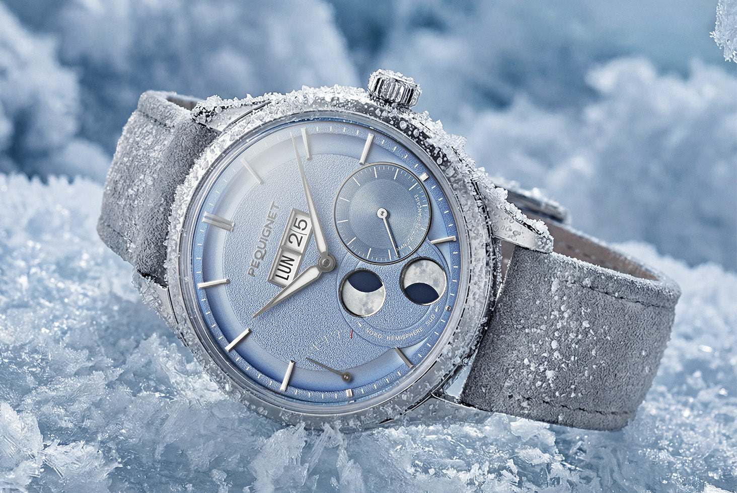 The Royale Paris watch, with its refined and timeless style, now comes with a icy blue dial. This new shade lends a fresh, frosty elegance to this Day-Date-Moonphase version. The delicate tone of the dial evokes the pure beauty of the Jura moutains in winter.