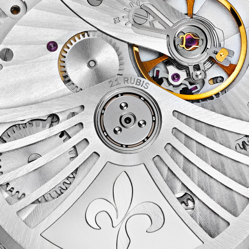 Until its creation in 2011, mechanical movements were no longer made in France. With the Calibre Royal®, the Manufacture Pequignet ushers in the renewal of French-made watchmaking excellence. With its 318 components, it is the first French-made mechanism to integrate its watchmaking complications on the same plate. Its design required 279 industrial plans and 150 tools resulting in the filing of 8 international patents. A delight to contemplate, efficient and accurate; it is a critically acclaimed movement.