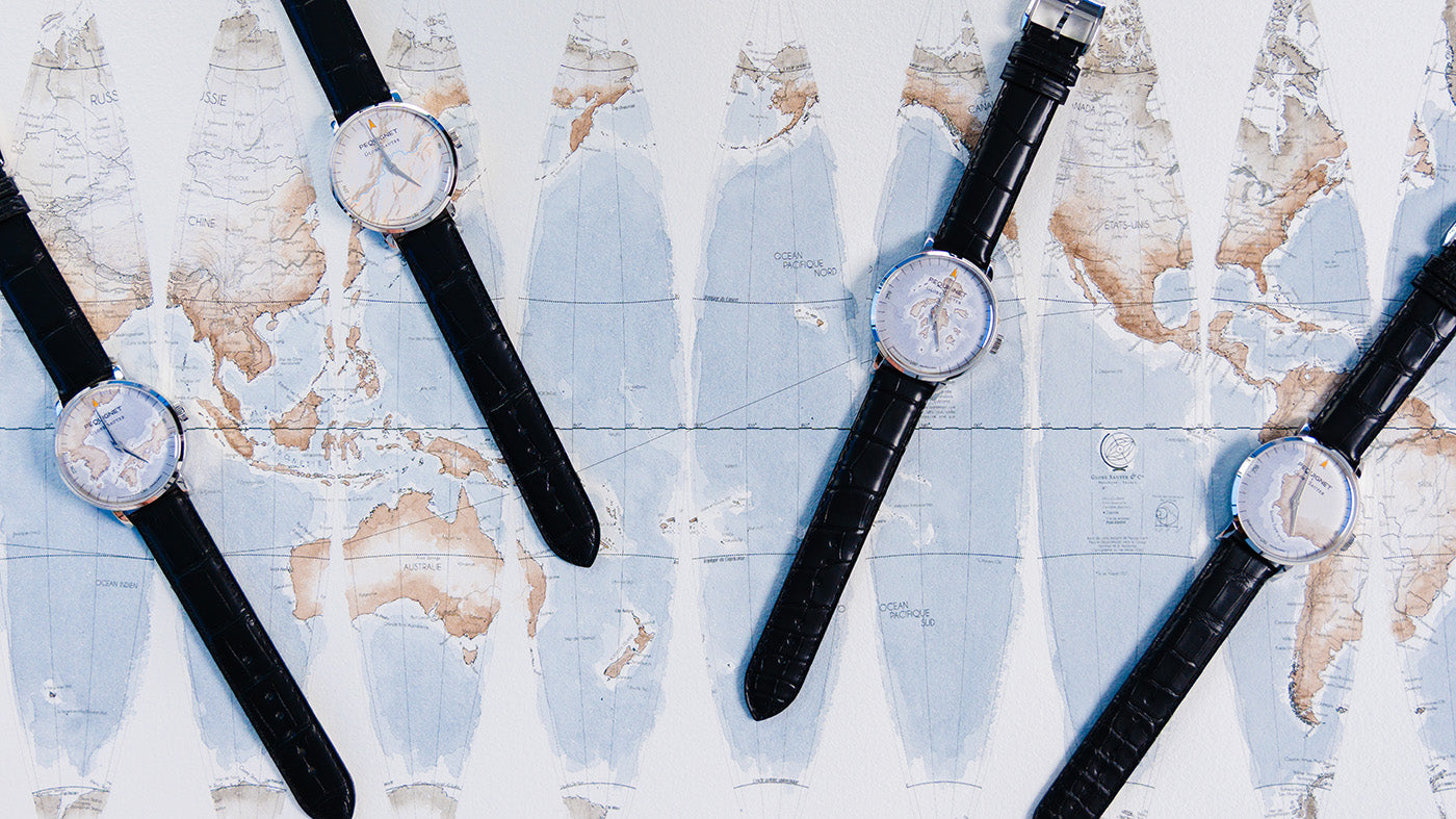 Each dial is a map of a corner of the world, its outlines printed in carbon black on 100% cotton paper from Zuber-Rieder paper mill (Boussières, 10 km from Besançon), then hand-painted in watercolour.