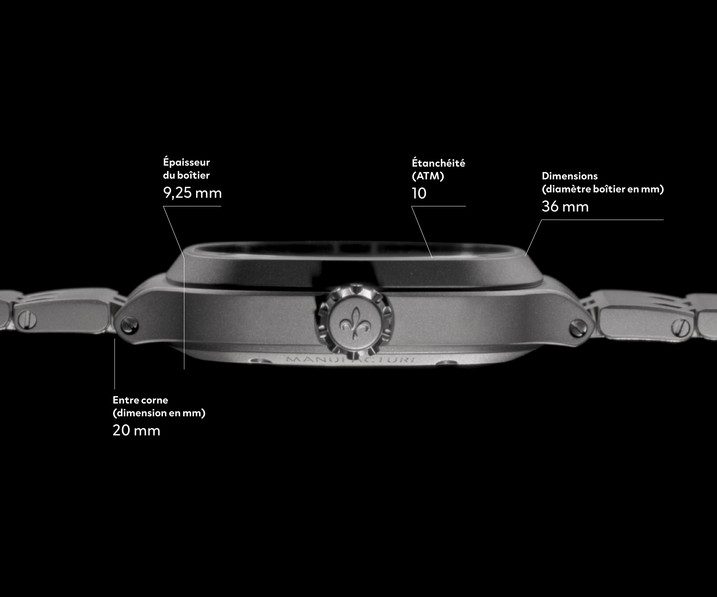 Elle est animée par le Calibre Initial®, troisième mouvement Manufacture conçu par Pequignet. Par souci du détail, ce dernier a été traité spécifiquement en Ruthénium pour se rapprocher au plus près de la couleur titane.